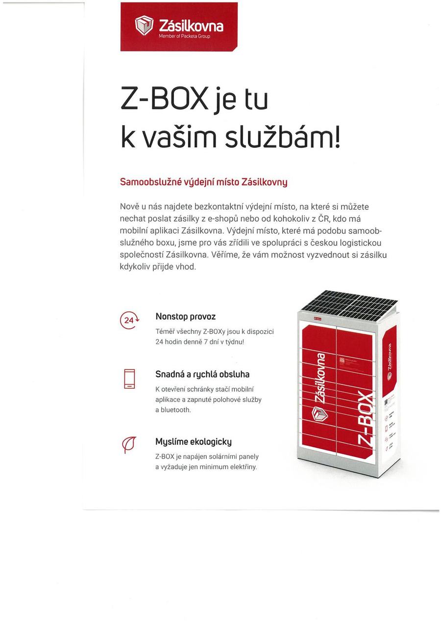 V pátek byl v naší obci nainstalovaný Z-BOX na parkovišti u obecního úřadu. Zavážen bude od 6.5.2021. Od 4.6.2021 bude již viditelný mezi výdejními místy a půjde do něj objednávat své zásilky.